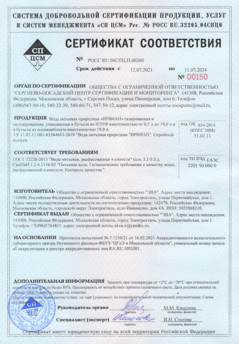 Качество воды подтверждается сертификатом, что "Ирвиан" является артезианской водой